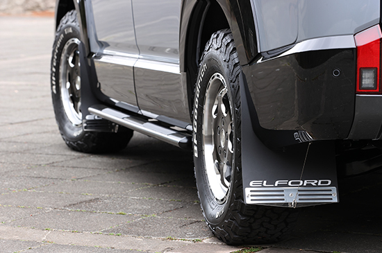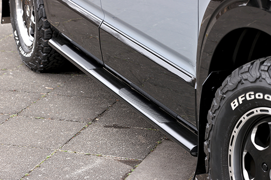 オーバル形状のパイプはパイプの厚み(高さ)がわずか50mmしかありませんので地上高を犠牲にする事が少なく、車高の高さをより強調させます。しかし、ステップ面(踏面)は90mmと奥行きのあるフラットに近い形状となるため、足を乗せやすくなっています。また、付属の滑り止めラバーを使えば雨天時等でも滑りにくい高い乗降性を発揮します。本体および取付ステーを半艶消しブラックの紛体塗装で仕上ていますので装着している事が目立たない仕様になっています。